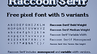 RaccoonSerif now comes in 5 style variants: Regular (variable width), Monospaced, Medium Weight, Bold Weight, and Mini (5px character height). Also improved character support for Regular variant...